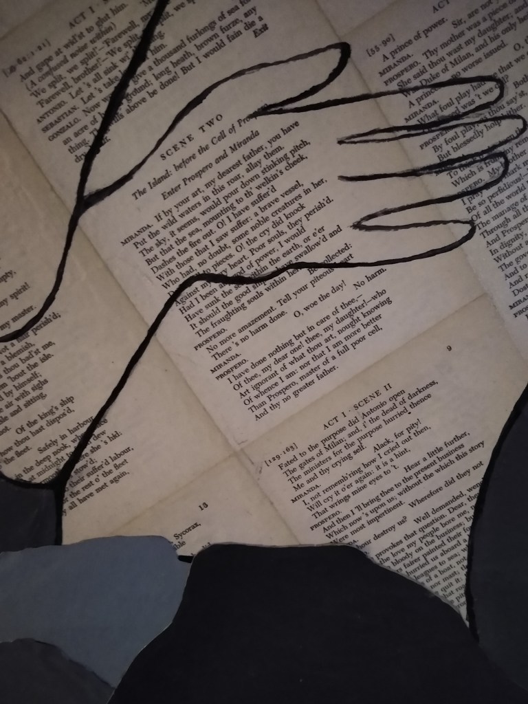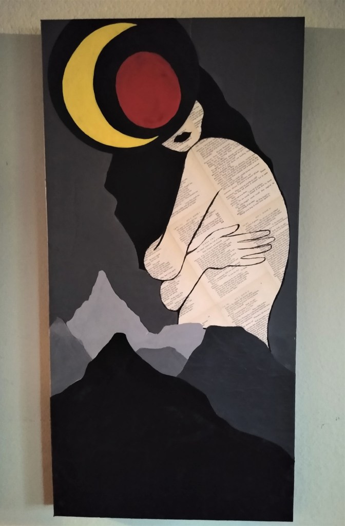The collage represents the fragmentation of the signifier through ripped and cut out pieces of paper, and the surrealist approach adds an intensity to the viewer/subject relationship through a dreamlike approach possessing unreal qualities conceived by the author somewhere between asleep and awake. The sun and moon covering the subjects face elevates her status and although history has manipulated how the viewed body should be positioned, she connotes a goddess being that pulls back from the viewer, drawing them in. The ripped pages from Shakespeare’s comedy The Tempest is open to interpretation, itself, adding mystery to the work.